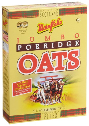 Can help reduce cholesterol when part of a fat modified low-cholesterol diet. Good source of fiber. Grown in Scotland. International Gold Medal Quality. No salt or sugar added. No preservatives. No cholesterol. no additives, just pure, natural goodness. Modern nutritional research has shown that eating as little as 2 ounces of Mornflake Oats every day as part of a diet low in cholesterol and fat help to reduce the cholesterol level already present in your bloodstream if it is above normal. As well as being rich in insoluble fiber like some other cereals Mornflake Oats also contain soluble fiber. Sensible eating and regular exercise mean a healthier you. Whole Oat Goodness. Pure as nature. Mornflake Jumbo Porridge Oats are as pure and full of goodness as nature intended them to be. They are the largest variety of flaked oats and make a wonderfully thick and nourishing porridge, containing all the endosperm, bran and grain that are a natural part of the oat kernel, one of nature's most perfect foods. Mornflake Oats have won International Gold Medals for quality, purity and consistency year after year at the World Cereals Exhibition in Amsterdam, Athens, Brussels, Geneva, London, Nuremberg, Valencia and Vienna. Product of the UK.